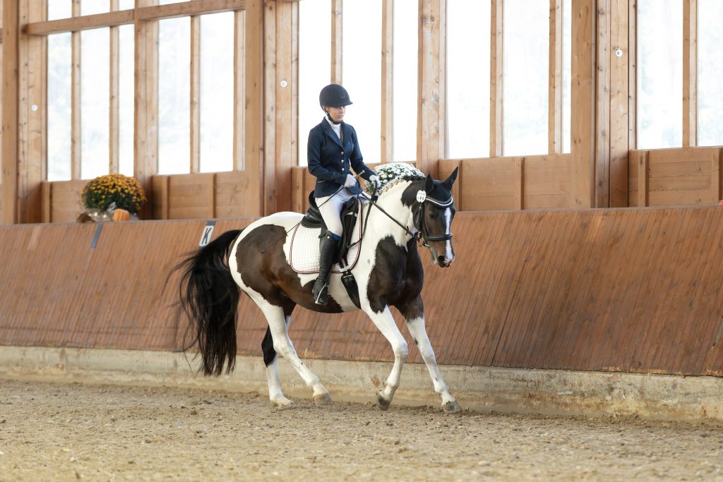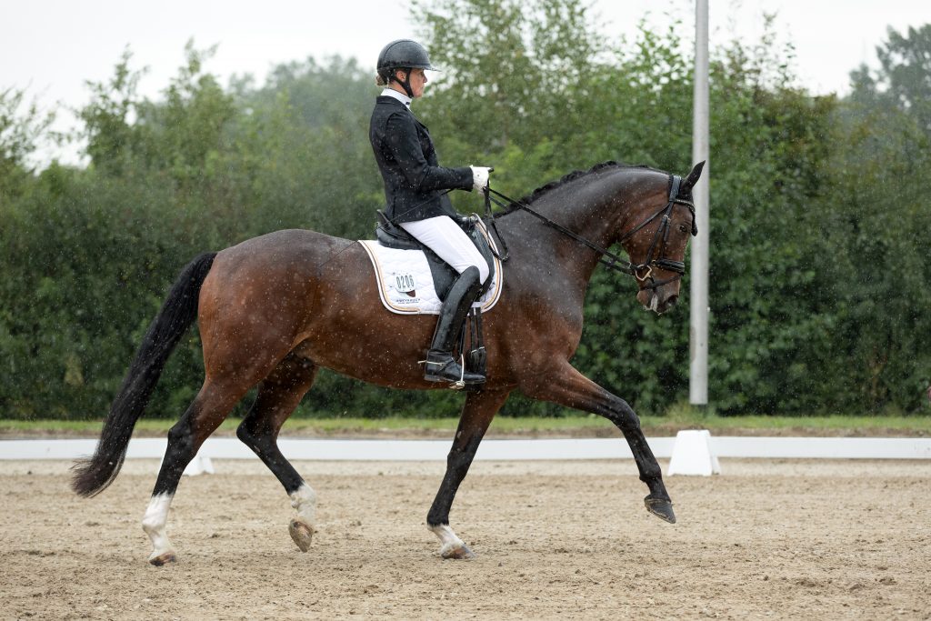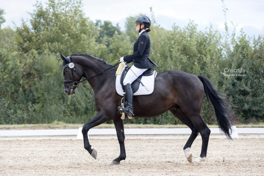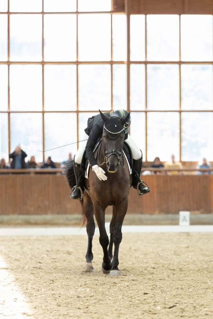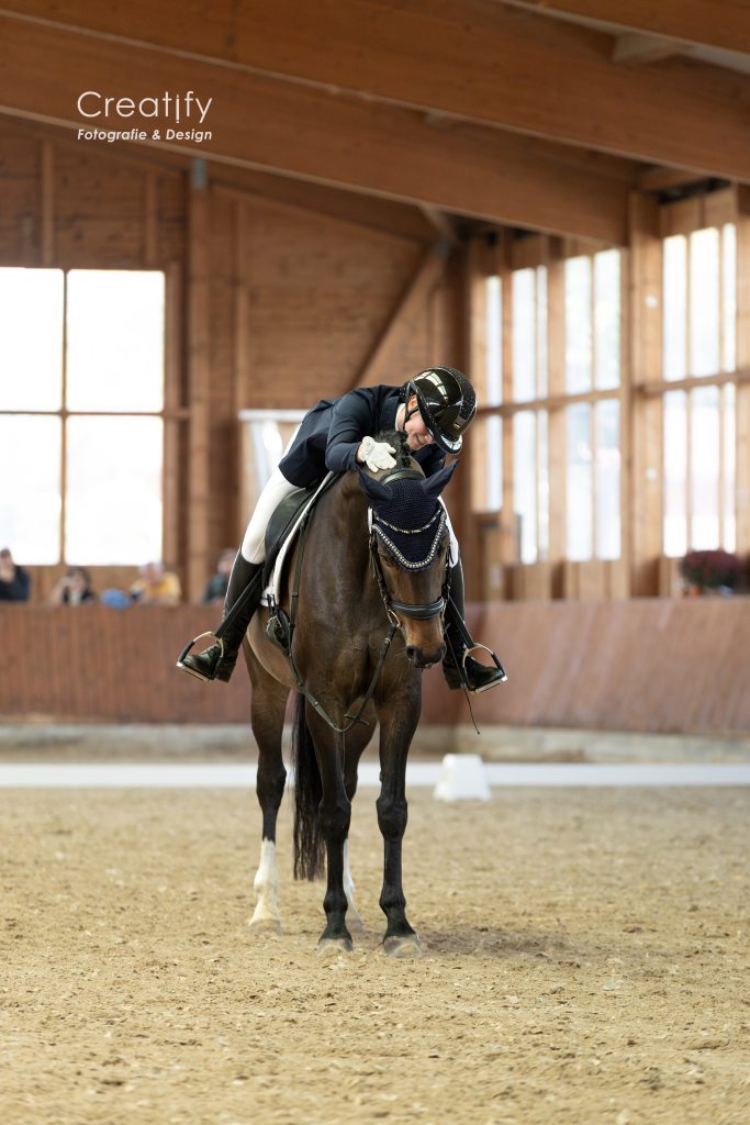 Der Sonntag begann leider mit heftigem Regen, doch wir haben das Beste daraus gemacht! Das Viereck erinnerte zwar kurzzeitig an einen Aquatrainer, aber der Boden blieb erstaunlich griffig und gut bereitbar. Dank unserer zweiten Reithalle konnten wir flexibel reagieren und das Abreiten kurzerhand nach drinnen verlegen.